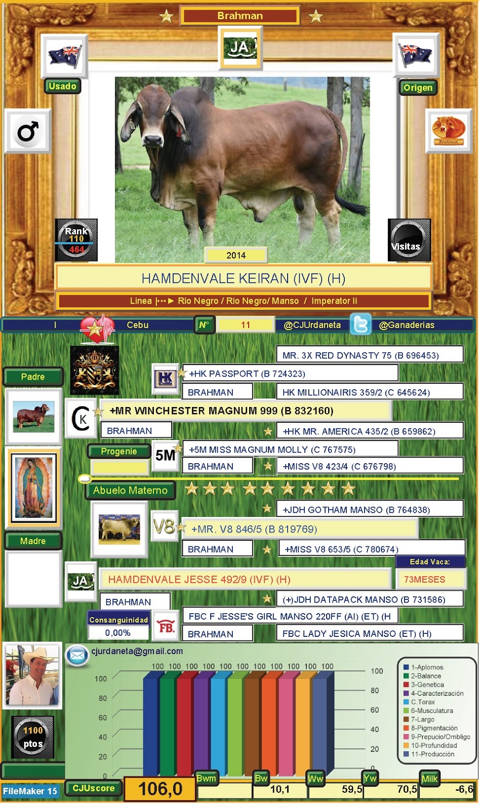 En mi opinión este animal tiene: Excelentes Aplomos ► Excelente Balance► Extraordinaria Genetica, con 9 Ancestros de Renombre ► Excelente Caracterización Racial► Excelente Circunsferencia Toraxica► Excelente Musculatura► Excelente Dimensión► Excelente Pigmentación► Excelente Prepucio► Excelente Profundidad►