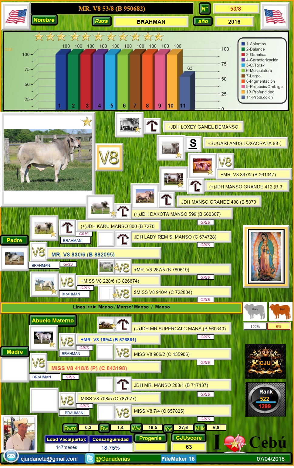 Functionality, longevity, fertility, low birth weight, and high carcass merit all traits that Mr. V8 53/8 brings to the table. He is a low maintenance bull - moderate framed, easy fleshing bull, extremely sound on his feet and legs, and has the highest Milk EPD of the sale. He comes by this naturally since his mother, Miss V8 418/6 was a moderate, easy keeping cow with an impeccable calving record, beautiful udder, that stayed around here for many years. 53/8 impressively passed a fertility test at 15 months old. He is the #2 low birth weight bull of the sale with a 70 pound actual birth weight and 1.4 BW EPD, making him a good option to improve functionality and fertility in any Brahman herd or make some of the finest, most productive F1 replacements you can find anywhere. In addition to those “convenience traits” he can also add some marketability to his male offspring as breeding stock or feeder calves, as he scanned the highest percent IMF of the sale at 4.35 and had the largest REA/cwt at an extremely impressive 1.53. Mr. V8 53/8’s profit-driver traits are also stacked in a performance oriented pedigree. His sire, Mr. V8 830/6, is a true beef bull out of +Miss V8 228/6, a former Houston Grand Champion Superstroke daughter out of V8’s Vanguard cow $Miss V8 910/4. His dam is a +Mr. V8 189/4 out of a maternal half sister to +Miss V8 98/6. This is an all star Brahman pedigree built for productivity and performance traits./En mi opinión este animal tiene / In my opinion this animal has: Excelentes Aplomos / Excellent Limbs ► Excelente Balance / Excellent Balance► Extraordinaria Genetica, con 6 Ancestros de Renombre / Extraordinary Genetics, with 6 Ancestors of Renown► Excelente Caracterización Racial / Excellent Racial Characterization► Excelente Circunsferencia Toraxica / Excellent Thoracic Circumference ► Excelente Musculatura / Excellent Musculature ► Excelente Dimensión /Excellent Dimension► Excelente Pigmentación / Excellent Pigmentation ► Excelente Prepucio/ Desirable sheath► Excelente Profundidad / Excellent Depth►